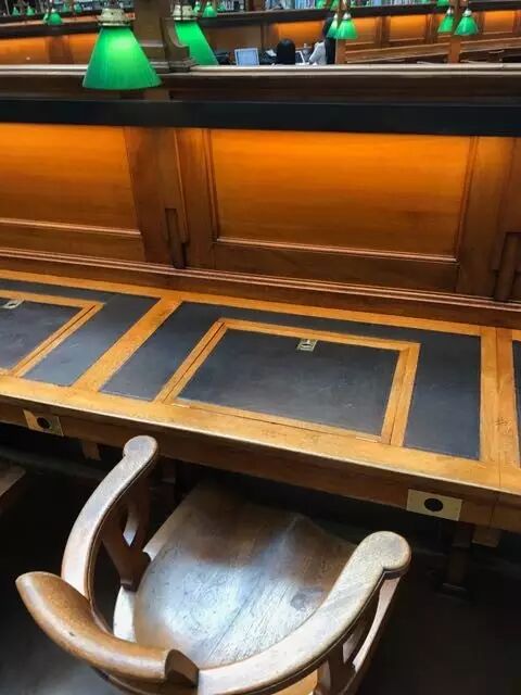 后来我找到个座位,看了两章《战争论》。每个座位前都有个台灯,但即使没有灯,光亮也非常好。座位也很舒服。桌椅虽然很老,但仍配有插座。桌子那个活动的地方可以掀起来固定住,根据读者需要调整书或电脑的角度。