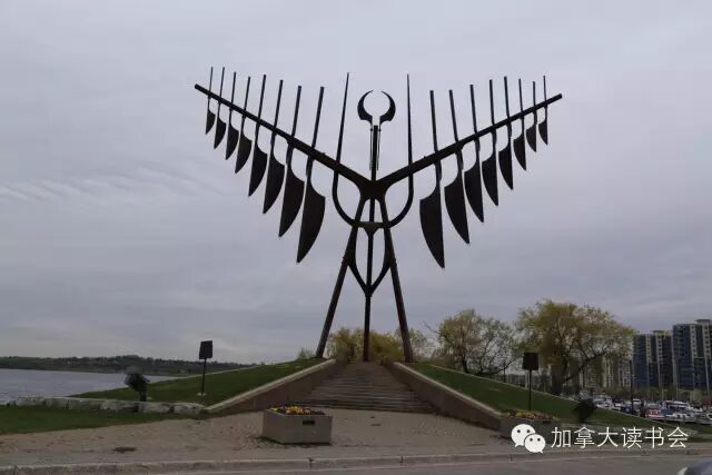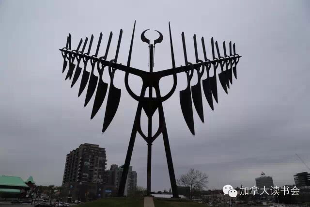 广场再往湖边走是当地一景,一个1986年设立的当代艺术摆设:The Spirit Catcher(摄魂器?),硕大的各种倒挂的镰刀、叉子及大刀等刑具在风的吹动下飘荡,人在下面走过,真有魂被摄走的感觉。我看到有两个游人从下面穿过,巨大的艺术品和那相对渺小的人体形成很强烈的对比,不过拿出相机时他们已经走过去了,那天游人很少,等了半天也没人再过去给我拍出张不错照片的几乎,可惜。