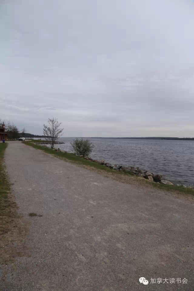 第二天早上,我洗澡后出门到湖边转了转。这里有个很让人失望的地方,就是湖边几乎都建了房子,湖滨成了房东的私人财产,想看湖,要走几百米,到公共的很小的地方才可以看到。我问过Harry和Carol,他们的房子多少钱,他说,几年前20多万加元买的,现在要30多万了。湖边的房子(跟他们的房子隔条路)要翻倍。