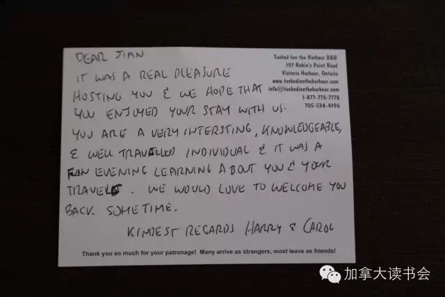 10点钟出门,跟Harry和Carol话别。Harry给我手写了张明信片!