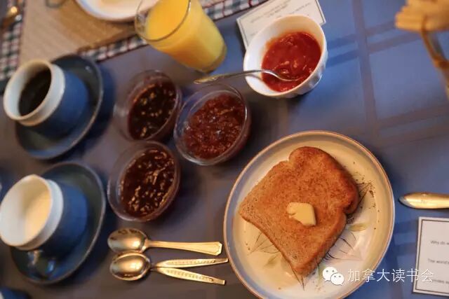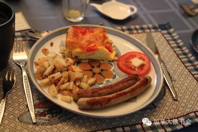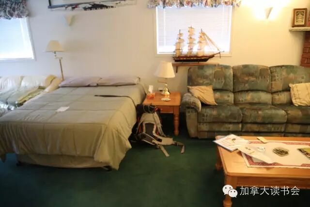 跑完步,洗了个澡,喝了杯橙汁,吃了个自己带的苹果,本来打算这个晚上就这么看书度过了。后来Harry来敲门告诉我,说他从傍晚起共打了50多个电话,结果我第二天要去的Tobermory那里酒店都客满了,唯一找到的是个130刀的地方。他问我要不要喝一杯,跟其他房客聊聊。我当然乐意,虽然没要任何酒精,只要了一杯水。其他的房客是两对夫妇。一对50多岁的,是这里的常客,以前来过几次;他们的亲属在这周围住,他们来时就住Harry这里,他们的儿子爬到过珠穆朗玛峰大本营,男的做电力和水力调度;另外一对男的是加拿大白人,女的是来自香港的华裔加拿大人,两人都是中学老师,带着一个小孩子。男的教西班牙语;我们聊起阿尔莫多瓦、唐吉可德和高迪;但我问他有没有什么可看的西班牙的书时,他除了《百年孤独》没说出什么别的来,说回头想想告诉我。第二天一起早饭时他也没给我任何推荐。女的教生物,人很聪明,问的问题很高明。我话总是太多;聊的很开心,不知不觉到了晚上11点。在这里唯一不爽的就是床垫子太软,不过我因为开车和跑步,比较累了,还是很快睡着了。