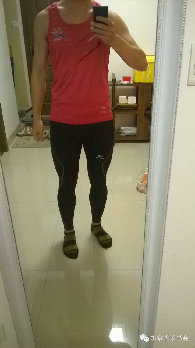跑起来老往上卷,T恤不断变成胸罩,而且流汗不顺畅,实在不舒服,后半程我就脱了拿在手上。效果是这样的: